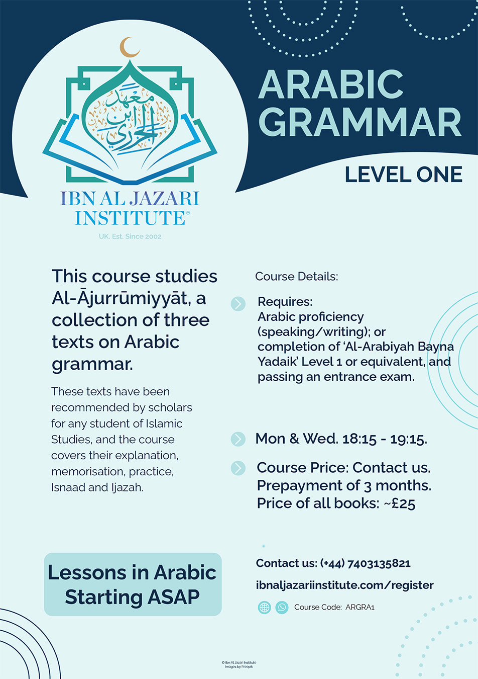ARGRA1: Lesson mainly in Arabic language, to understand the main grammatically rules. The book “Al Ajoroumyiaat” grouping three main texts of scholars of the Arabic Grammar. Studied in deep with a lot of practices to make the grammar natural and easy to implement. After this level students should be able the understand the necessary concepts of the Arabic sentences and take benefit form text that they may read (Qura’an, Hadith, Stories…). A certification will be given and an Idjazah of the book to reported all the way back to the author.