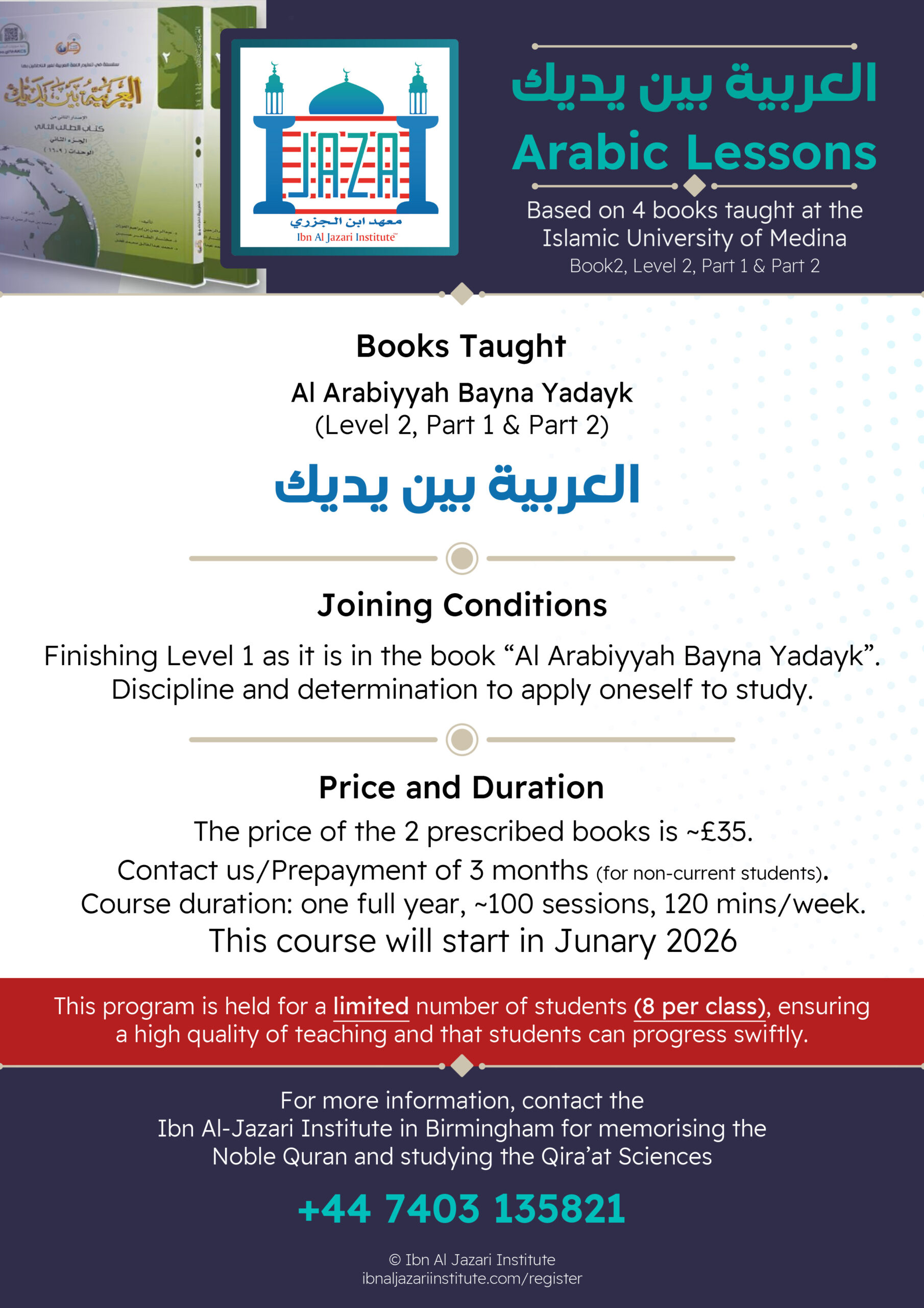 ARGRA2: Lesson completely in Arabic language, to take the students to a medium level of the grammar rules. helping them to talk without any grammar mistake. A certification of the lesson will be issued, plus an Idjazah of the book in the programme.